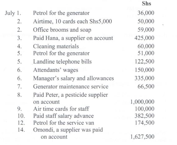 On 1st July 2017, the Petty Cahier received the cash float Shs5,000,000 and made the following payments: