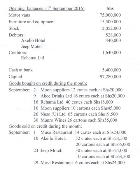- Dan Okello, a dealer in soft drinks and spirits had the following transactions for the month ended 30th September 2016
