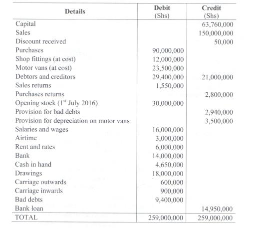 23. The Trial Balance below relates to B. Tabaro for the year ended 30th June 2017: