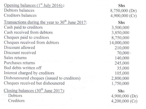 - Dr. Creditor’s Account Shs3,000,000, Cr. Purchases Account Shs300,000
