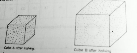 32. Two different sized cubes of colourless jelly A and B were used to represent models of living organisms. They were submerged in a coloured dye for a period of time and then removed and cut into half.