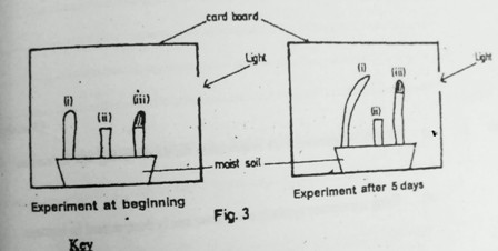 32. Figure 3 shows the effect of unidirectional light on the growth of plant shoots. Study the figure and answer and answer the questions that follow.
