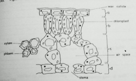 c) Using evidence from the diagram, describe how the structure of a leaf is suited for photosynthesis.
