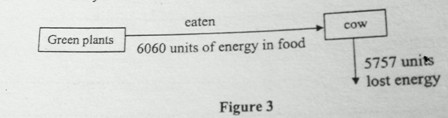 32. In a food chain, when energy is transferred from one atrophic level to another, some of it is lost. Figure 3. Shows such a transfer of energy in and out of a cow in year.