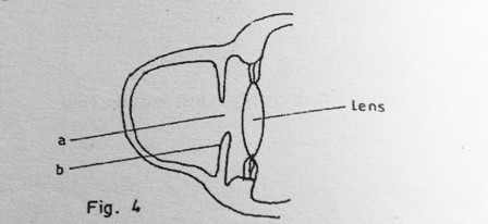 d) In the space below, draw the shape of the lens only, when the eye is focusing on a near and distant object respectively.