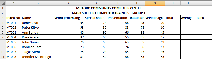 b) The table below shows scores of computer trainees in group 1 at Mutoro Community Computer Centre.