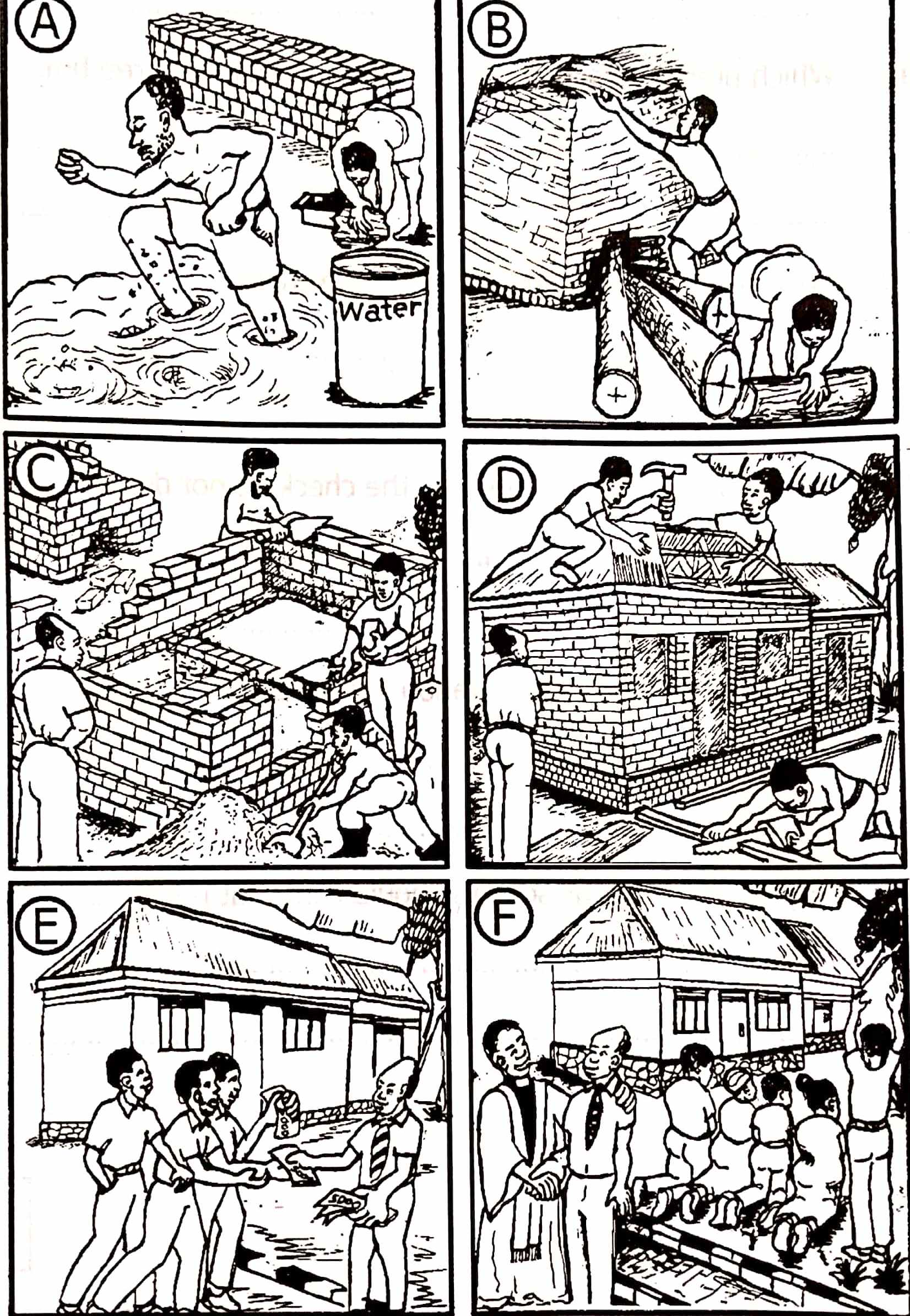 (i) Give a suitable title for the story. - 54. The pictures A-F tell a story. Study them and write one sentence to describe what is happening in each picture. You may use any of the following words to help you: