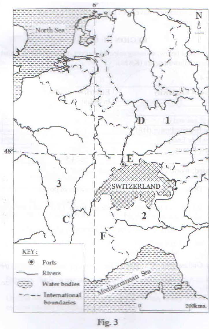 10. Study figure 3, part of map of Europe showing the location and position of Switzerland and answer the questions that follow.