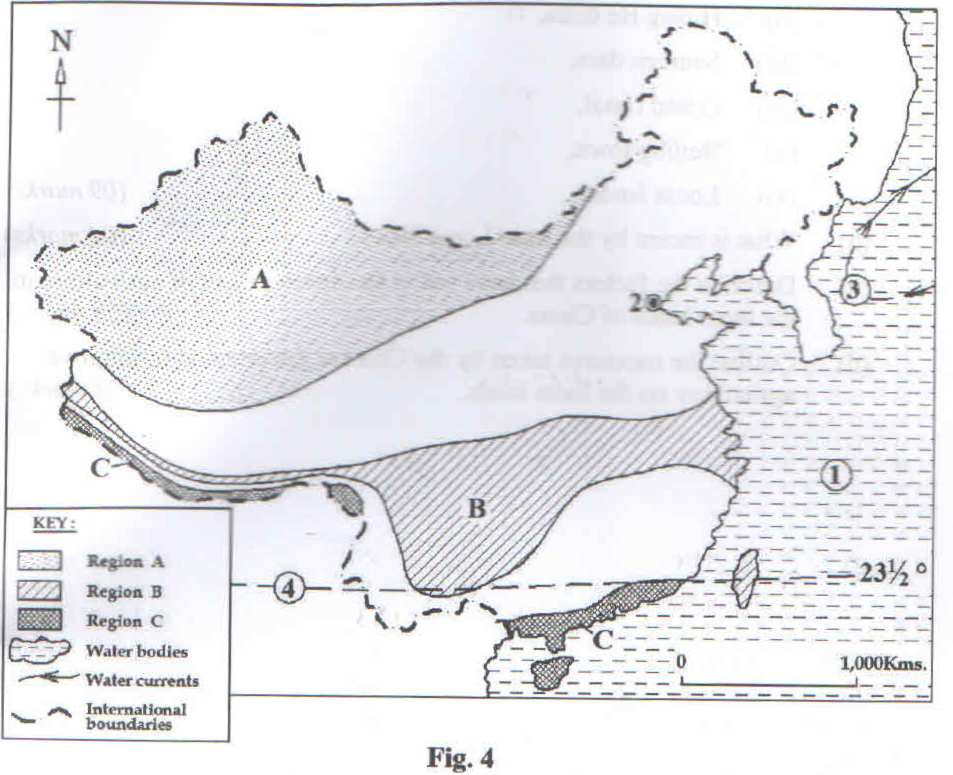12. Study figure 4, map of China showing the distribution of mean-annual rainfall and answer the questions that follow:
