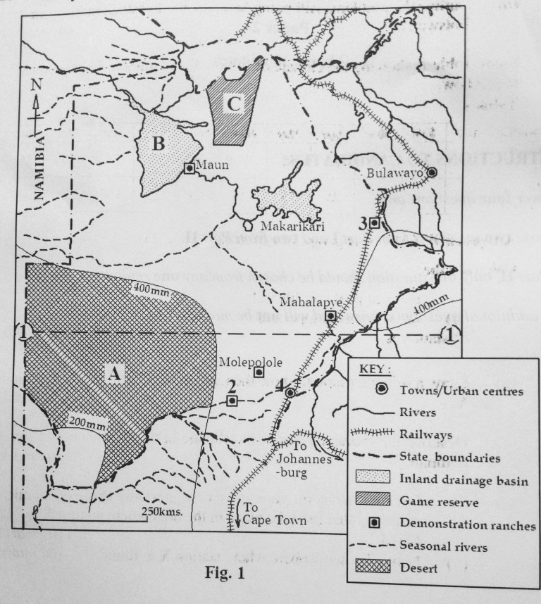 2. Study Fig 1 map of Botswana provided and answer the questions that follow.