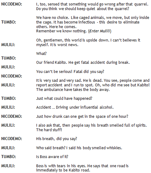 He sat at the table in the hot tent to compose an official report to be radioed to Brigadier Thames. He had just finished doing this when the inspector arrived. In the mid-afternoon the sun was hot. A tired-looking but high-spirited chief conducted them to the cell where the dead lay. The bodies were laid out in rows. There was a row of worthy men, the home guards, a row of not-so-good men, the villagers, and lastly, a little way away from the others to avoid contaminating them, the row of the undesirables the terrorists. Chief Kahuru Wamai’s initiative. He was so proud to show the dead bandits that he forgot to mourn his dead followers. The cell reeked of death.