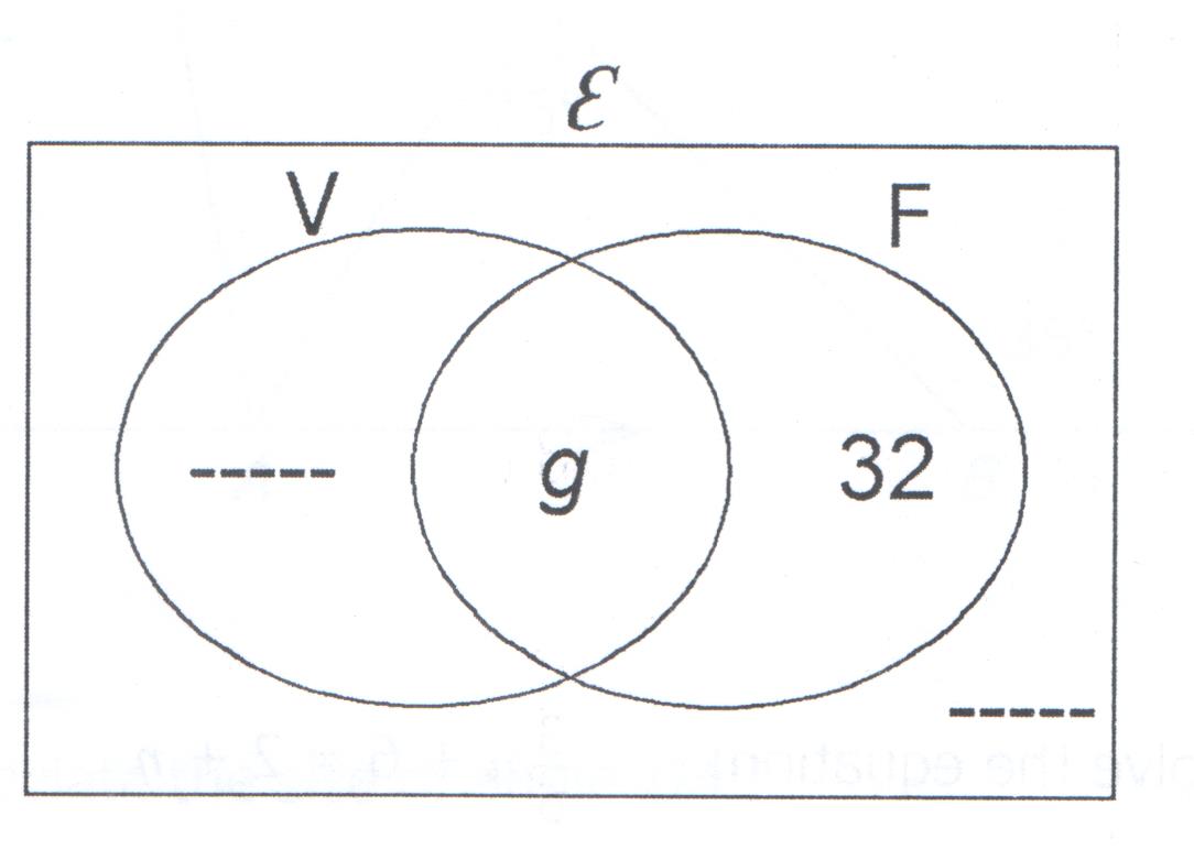 23. In a class, 32 pupils play football (F) only, g play both volleyball (V) and football, (2 g – 10) play volley ball but not football while (g -2) play neither of the two games.