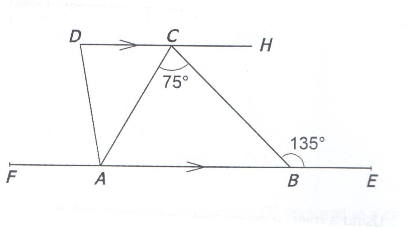 In the diagram below, line DH is parallel to FE. Angle ACB = 750 and angle CBE = 1350. Angle FAD is twice angle DAC. Study the diagram and use it to answer the questions that follow.