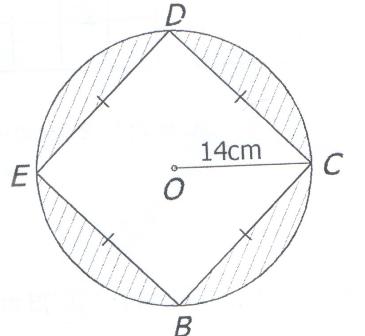 30.The diagram below shows a square BCDE enclosed in a circle with centre O and radius 14cm. Parts of the circle are shaded as shown. Study the diagram and use it to answer the questions that follow.