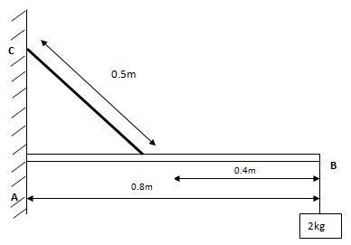 13. The figure below shows a uniform beam of length 0.8 meters and mass 1 kg. The beam is hinged at A and has a load of mass 2kg attached at B.