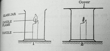 50. The diagram numbered 1 and 2 below show an experiment done by a p7 class. Diagram 1 shows a burning candle in an open jar. In digram 2, the jar was covered as shown. Use the diagrams to answer the questions that follow.