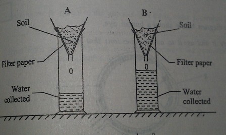 48. Equal amounts of water were poured onto soil A and b in the diagram below:
