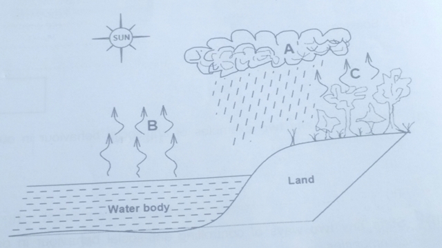55. The diagram below shows the water cycle. Study and use it to answer the questions that follow.