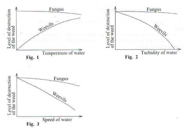 a) From figures 1, 2 and 3 describe the level of destruction of the weed by each of the organisms under different conditions of water.