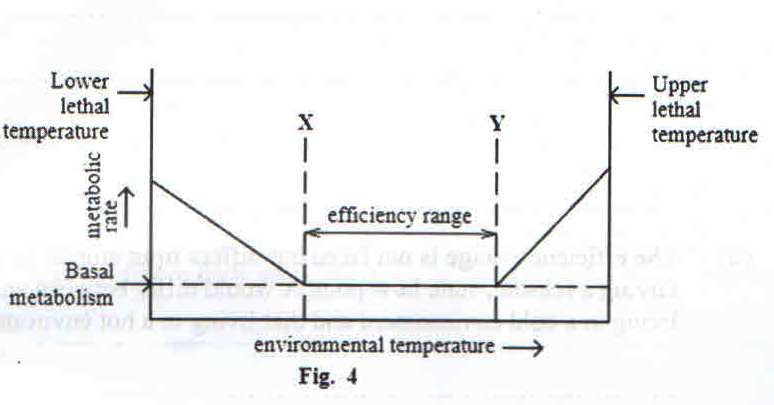 d) The efficiency range is not fixed but differs from animal to animal. Giving a reason, state how point X would differ between an animal living in a cold environment and that living in a hot environment.