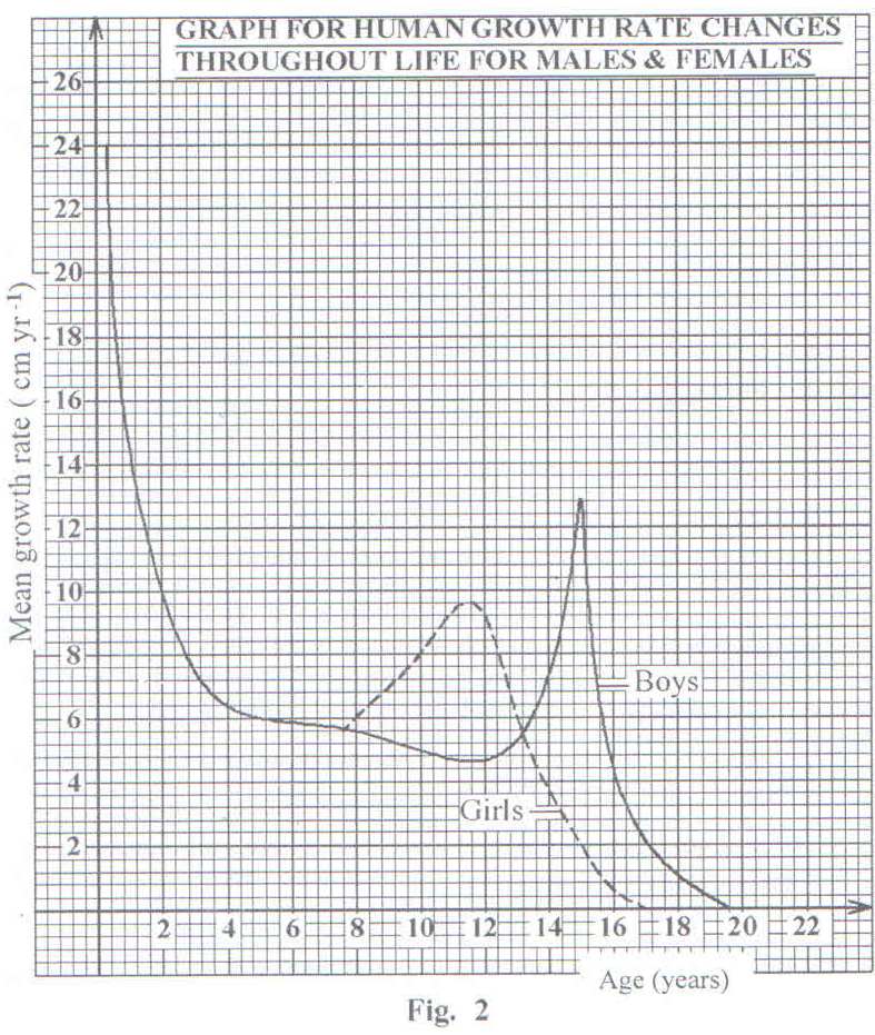 4. Figures 1 and 2 show growth patterns of organs in humans and the mean growth rate in the different sexes respectively. Figure 1 represents the size attained by the human body organs from birth, expressed as a percentage of the total post natal growth. Figure 2 represents the mean growth rate changes in centimeters per year, in boys and girls, from birth to maturity. Study the figures and answer the questions that follow.