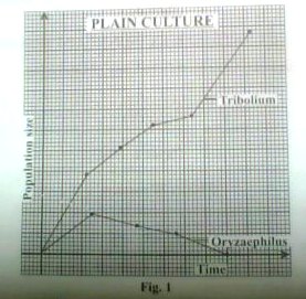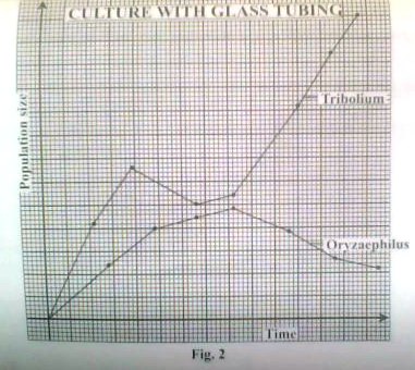 3. Figures 1 and show the results of experiments carried out on two species of flour beetle, Tribolium and Oryzaephilus, which were grown together in slightly different environments. In figure 1 Tribolium and Oryzaephilus were grown in plain flour culture while in figure 2 they were grown in a culture which had glass tubings. For each experiment four adult beetles of each species were introduced in the culture and the population size of each species was determined at regular intervals. Study the information and answer the questions that follow.
