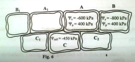 42. Figure 6 shows two guard cells A and A1, with adjacent cells B, B1, C, C1 and C2. The values of the solute potential and pressure potential; shown in cells A and B are exactly the same as those for cells A1 and B1 respectively. Similarly, the water potential indicated in cell C is the same as that in cell C1 and C2. Use the figure to answer the questions that follow.