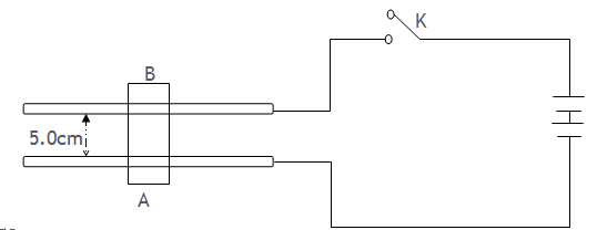 b) Figure 1 shows an aluminum bar AB resting on two horizontal aluminum rails connected to a battery through switch K. A magnetic field of flux density 0.10T, acts perpendicularly into the paper.