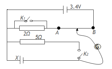 d) A uniform resistance wire AB, 100cm long and of resistance 4.0Ω connected in series with a 2.0Ω resistor to a driver cell of e.m.f 3.4V and negligible internal resistance. Cell X is connected to a 5.0Ω resistor through switch K2. When K1 is closed and K2 is open, the balance length is 53.0cm,