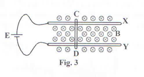 6. a) In figure 3, X and Y are smooth conducting rails connected to a source of e.m.f, E. CD is a metal rod of length l m placed horizontally on X and Y perpendicular to magnetic field of flux density B.