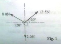 d) Three forces of 8.0N, 12.5N and 2.0N act on a body of mass 0.7kg as shown in figure 1.