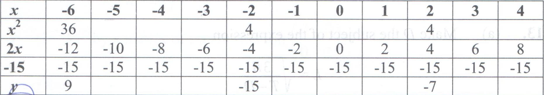 11.Copy and complete the table of values below for y = x2+ 2x - 15.
