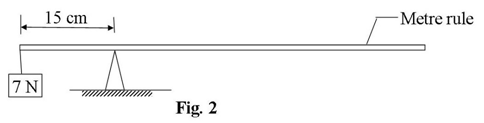 (e) A uniform meter rule is balanced horizontally on a pivot at the 15 cm mark when a load of 7 N is attached at the zero mark as shown in figure 2