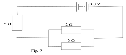 (c) A battery of e.m.f 30 V and negligible internal resistance is connected across three resistors of 5 Ω, 2 Ω and 2 Ω as shown in figure 7.