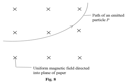 (d) The diagram in figure 8 shows the path of a particle P, emitted from a radioactive of rock. Passing through a religion of uniform magnetic field directed perpendicular into paper.