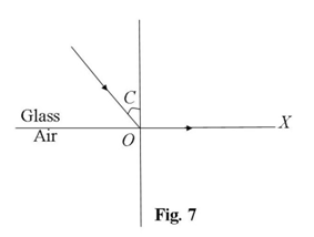 (b) (i) A ray of light travelling from glass it air is refracted along the boundary OX as shown below in figure 7