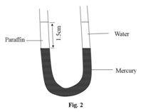 18. Figure 2 shows a U – tube containing mercury, a column of water of density 1000kgm-3 and a column of paraffin of density 800kgm-3. Find the length of the water column if the length of the paraffin column is 15cm.