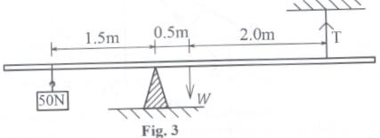 ii) A uniform beam of weight 500 N is made to balance horizontally on a knife edge by a string tied near one end and a weight of 50 N hanged near the other end as shown in figure 3.