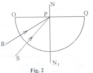 b) Figure 2 shows rays of light incident on semi-circular glass block. Ray SP is refracted along PQ