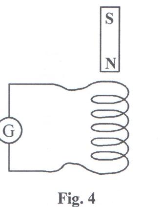 c) A small bar magnet is released from above a long coil of many turns connected to a centre-zero galvanometer as shown in figure 4