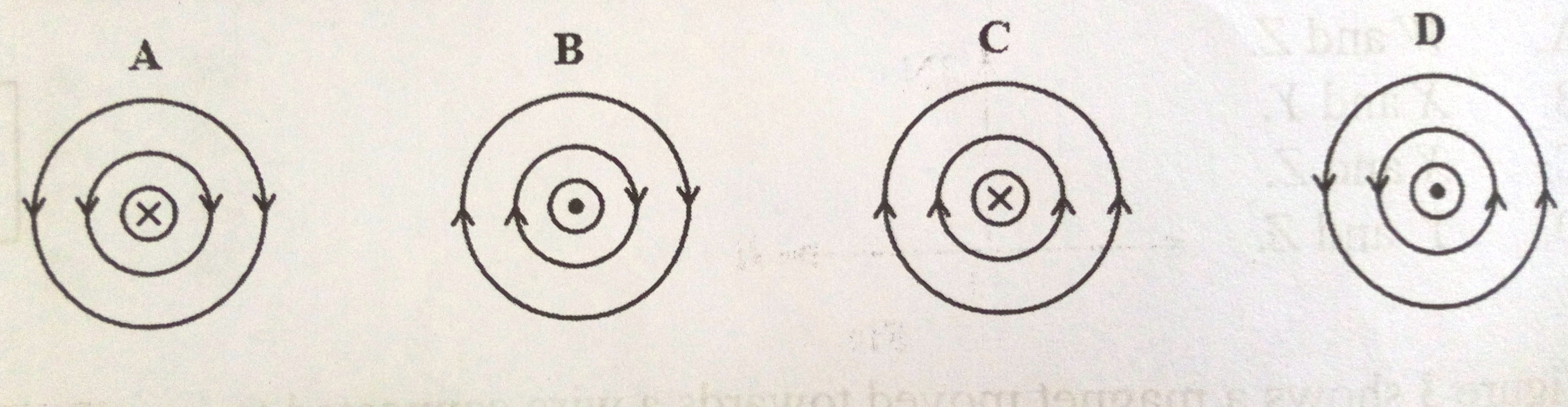 31. Which one of the following diagrams shows the correct direction of magnetic field around a conductor carrying current?