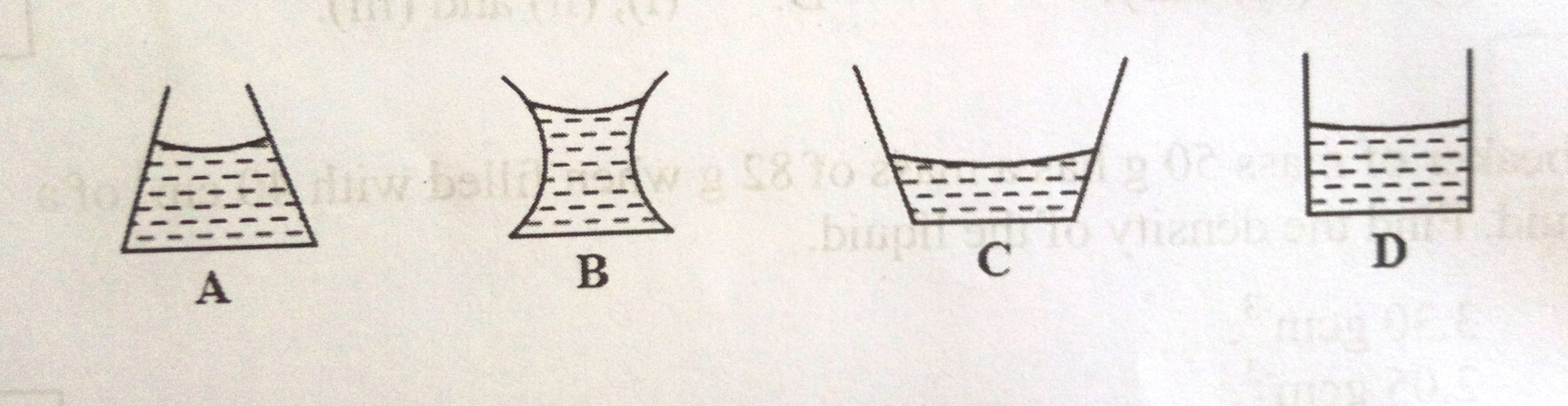 40. The diagrams below show different containers with equal volumes of the same liquid at the same temperature. Which one of the containers will have the volume of the liquid reduced most after sometime?