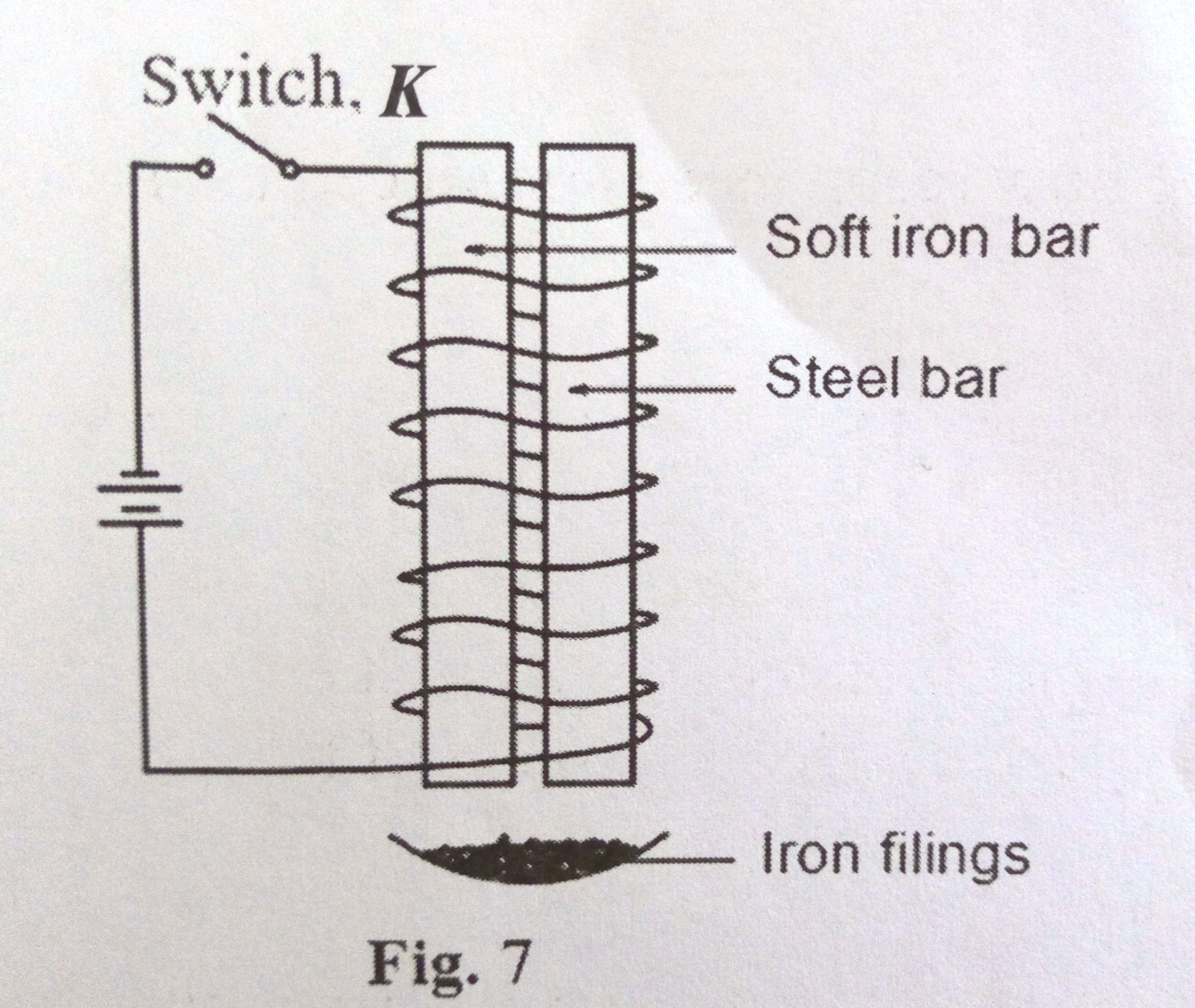b) A soft iron bar and steel bar are suspended inside a coil above a container of iron filing as shown in figure 7.