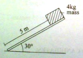 d) A block of mass 4kg is released from rest at the top of a smooth plane 5m long and inclined at 300 to the horizontal as shown below.